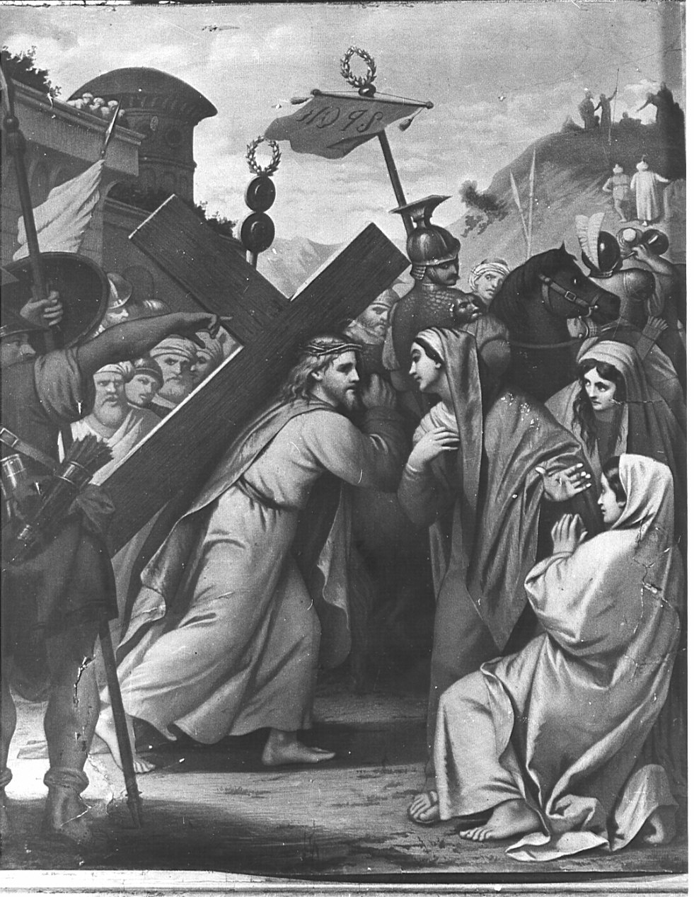 Personaggi: Cristo; Madonna. Figure maschili: soldati. Oggetti: croce; vessillo. Armi: lance