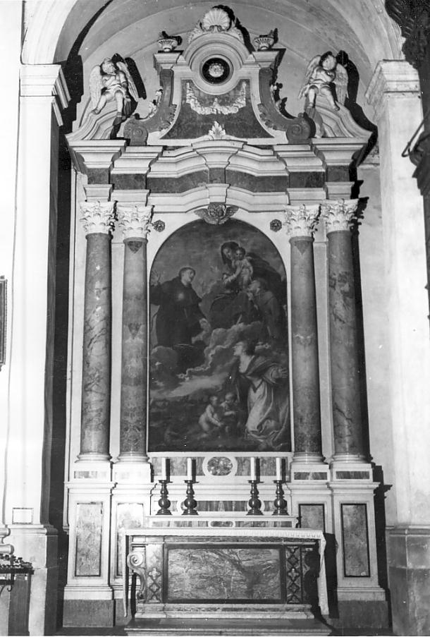 Quattro colonne monolitiche di brecce variegate chiare fiancheggiano la pala e sostengono un frontoncino spezzato, di stile composito, con due angioletti