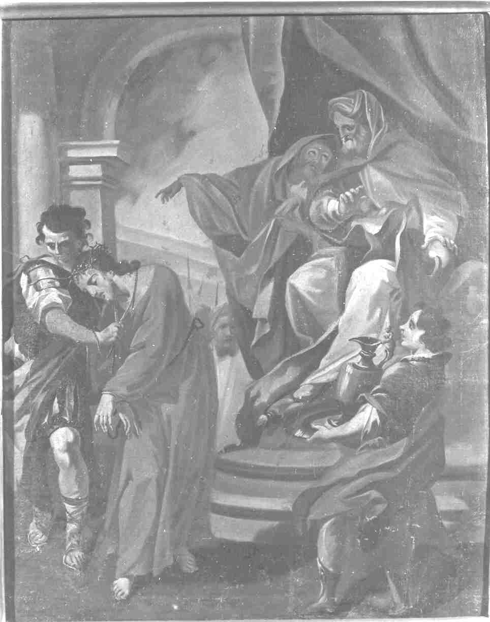 - NOTIZIE STORICO CRITICHE Per la serie della Via Crucis si vedano le schede NCTN 03/00045833- 03/45846. La serie dei quattordici dipinti è opera di un coloritore ignoto, forse locale, dell'Ottocento. I particolari stilistici inducono a collocare l'opera in tale secolo, nonostante gli evidenti richiami tiepoleschi (qualche citazione dalla celebre Via Crucis di San Polo a Venezia) per le seguenti ragioni: il carattere settecentesco dei dipinti è di seconda mano, di derivazione; molti particolari risultano troppo edulcorati (occhi, mani, piedi) per essere ipotizzabili fuori da una sensibilità tardo-romantica; il colorito è caramelloso; i dipinti conservano un certo sapore di accademia e di copia