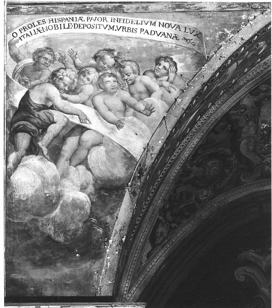- ISCRIZIONI nei cartigli - O PROLES HISPANIAE PAVOR INFIDELIUM NOVA LUX/ FER ANTONI GRE XPI PATROCINIUM NE PROLAPSIS VENIAE TEMPUS BREVE CREDITUM DEFLUAT INNANE - lettere capitali - a pennello -