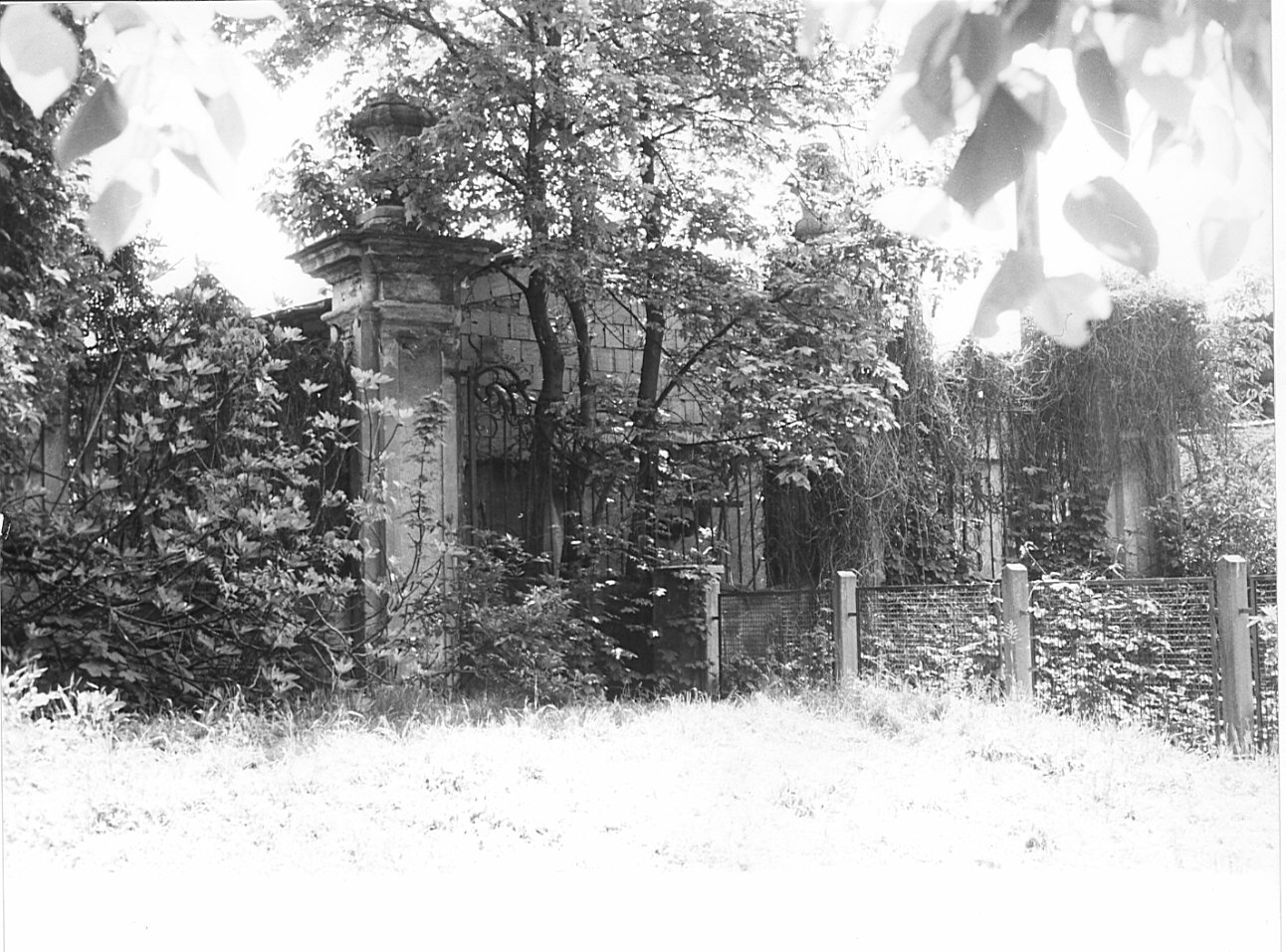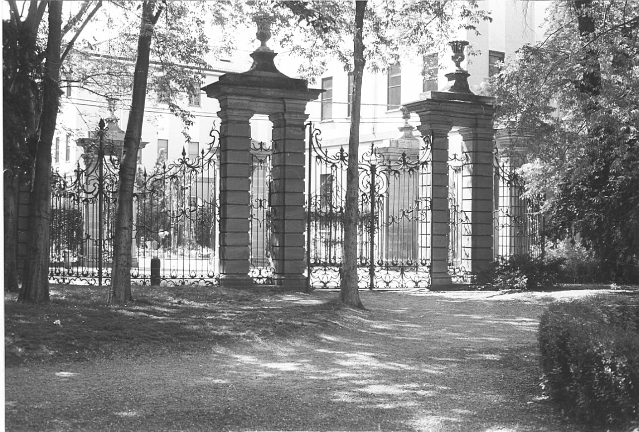 Imponente cancellata articolata in due griglie laterali ad emiciclo, limitate da pilastri multipli, ed in una griglia centrale a due battenti, limitata da pilastri binati sormontati da vasi scolpiti in arenaria, con trofei di frutti; i ferri sono in quadrello con particolari in lamiera, con disegno di barre berticali animate da volute variamente intrecciate e contrapposte e culminanti in cimase mistilinee. Al di là della strada si leva simmetrico il cancello gemello