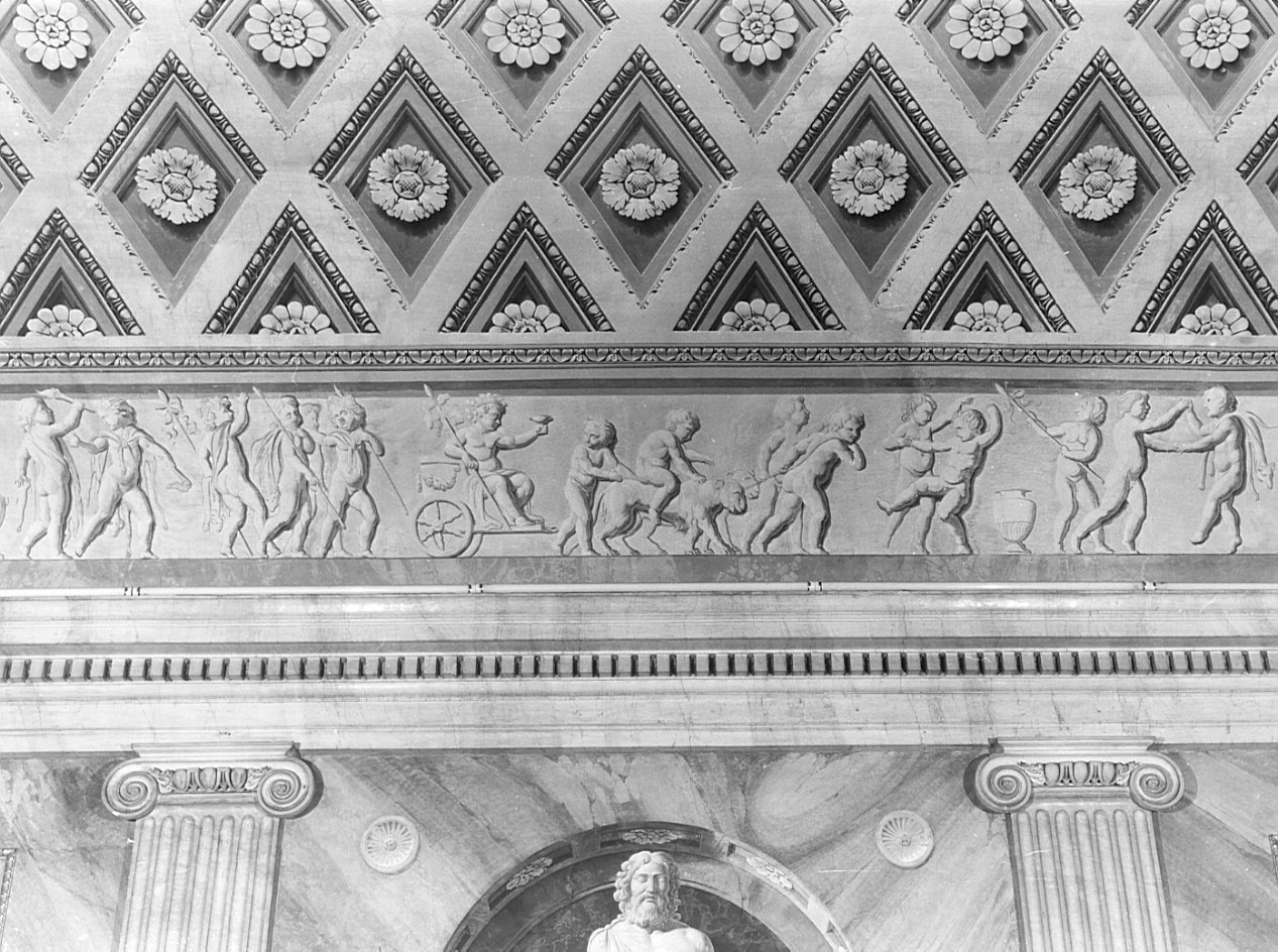 Volta dipinta. Tutt'intorno, corre una fascia decorativa raffigurante Baccanale, putti, satiri; Pan e Silene, culminante nella celebrazione dei sacrifici, il tutto a grisaille; le pareti sono coperte in stucco lucido ad imitazione del marmo