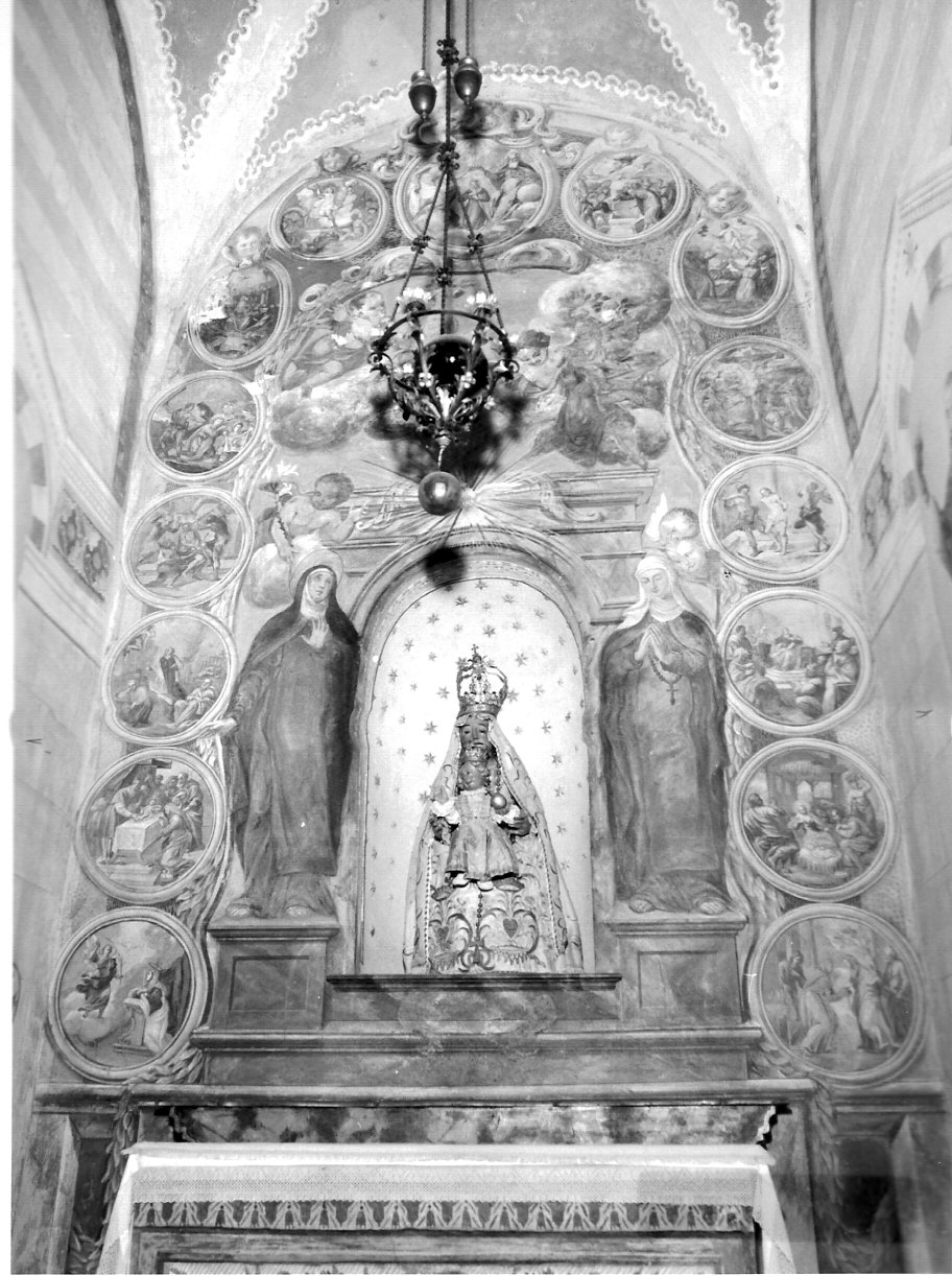 Sopra la mensa d'altare e ai lati della nicchia, sono raffigurate sopra 2 alte basi le Beate Caterina ( a sinistra con velo nero) e Giuliana, entrambe in piedi in estasi e preghiera, sormontate da puttini festanti in volo. Attorno, un arco di tondi con i Misteri del Rosario. Alcune scene paiono più complesse, con molti personaggi e delicati particolari resi con cura, mentre altre hanno composizione più semplice con figure delineate rapidamente. Toni pacati