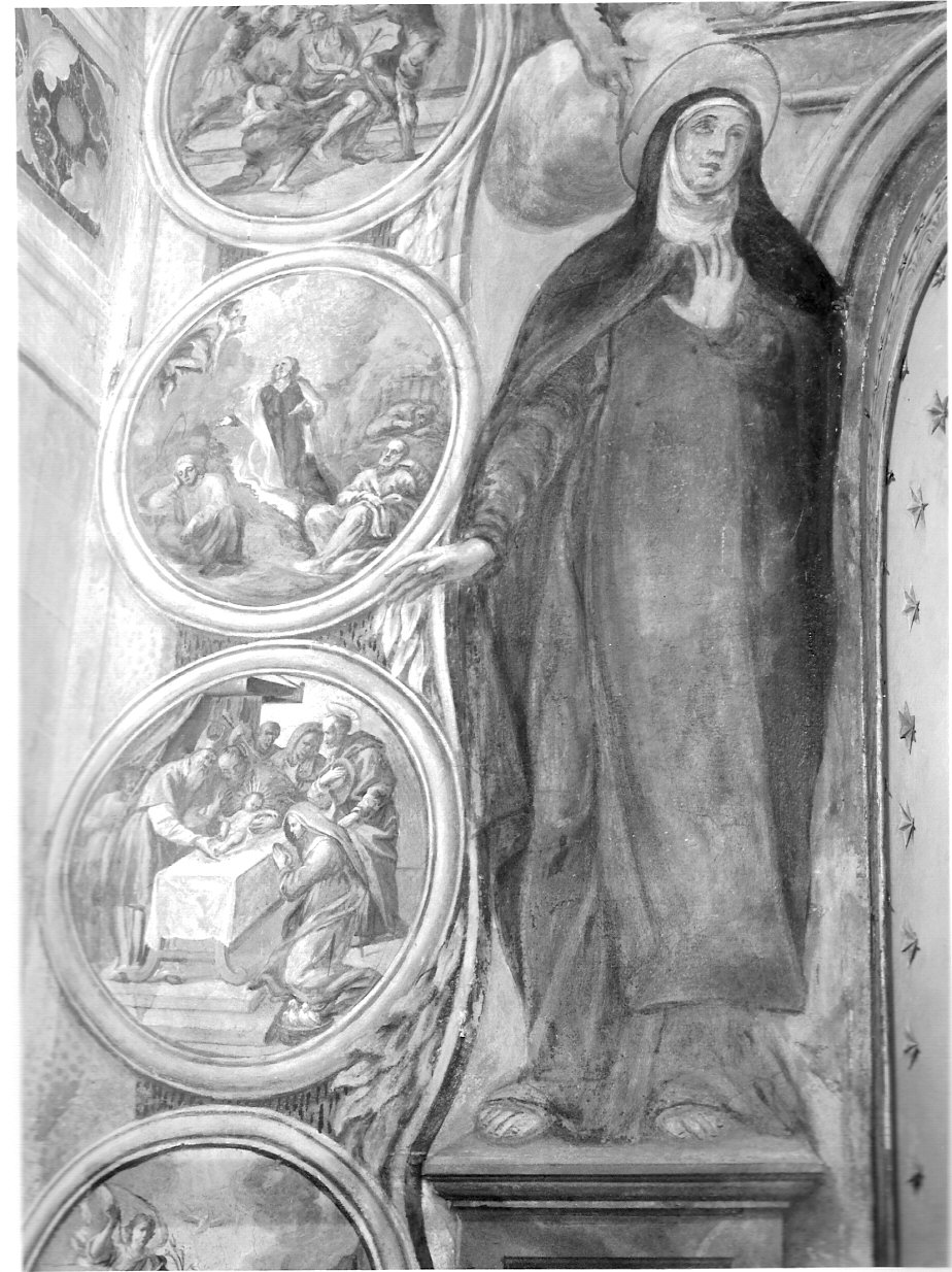 - NOTIZIE STORICO CRITICHE La torre degli Ariani sorge in posizione elevata nel giardino entro la cinta del monastero e fu così chiamata perchè per tradizione costituì l'ultimo baluardo di difesa degli eretici. In seguito alla sconfitta infertagli dalle truppe cristiane guidate da sant'Ambrogio prese il nome di torre della Vittoria. Dopo la fondazione del monastero nel 1476 i resti dell'antica torre furono inglobati nella clausura e poi consacrati come chiesa "overo Oratorio da Monsig. Reverendis. Fabricio Marliano Vescovo di Piacenza...e ciò fu l'anno 1500 alli 7 aprile, et consacrolo sotto titolo dell'Ascensione e di S. Ambrogio della Vittoria, come appare per instrumento autentico (Morigia)
