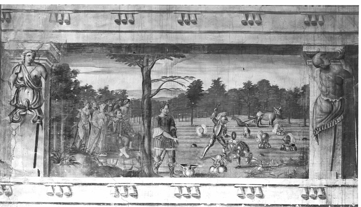 Personaggi: Giasone; Eete; Medea. Figure maschili: cortigiani; soldati. Figure femminili: dame. Paesaggi: paesaggio rurale. Piante: alberi. Animali: bue. Oggetti: aratro; sassi