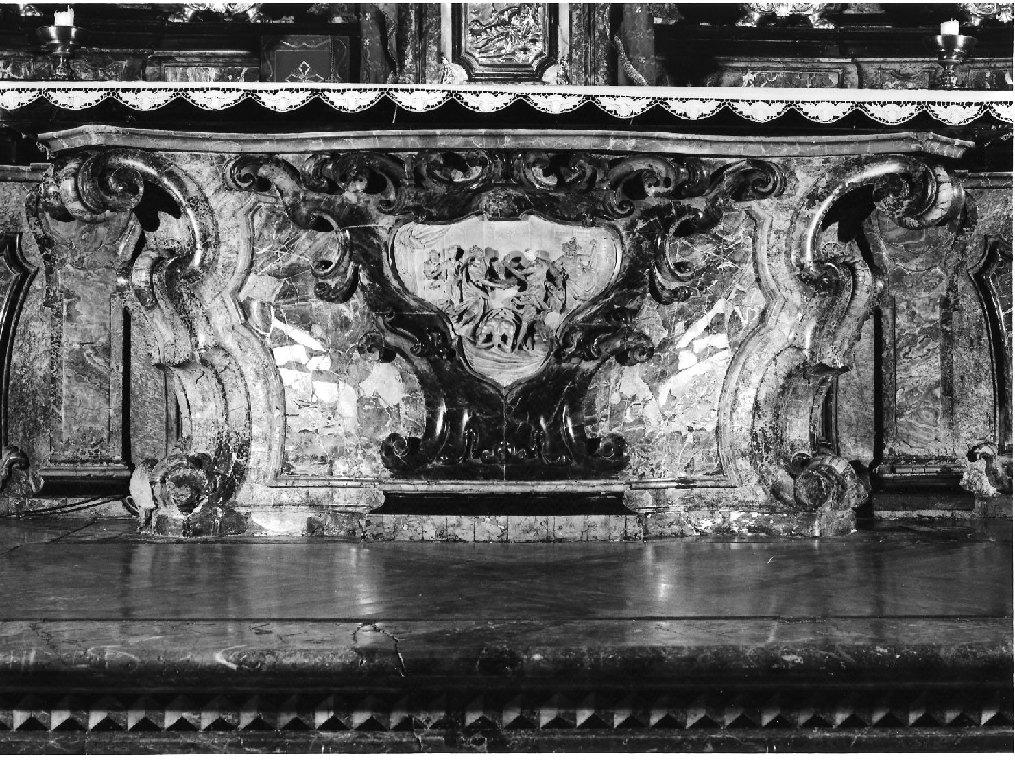 Paliotto aggettante con profili mistilinei (analogamente ai lati specchiati) e formella centrale con la Decollazione del Battista in marmo bianco scolpito