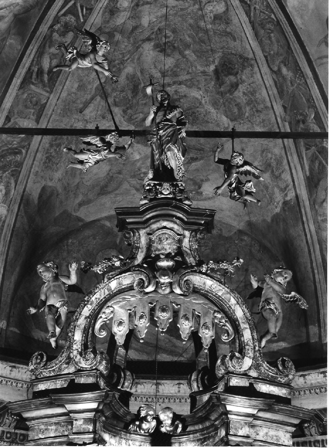 Alto e mosso ciborio, su basamento sagomato con 4 colonne e 2 pilastri, architrave aggettante e fastigio curvilineo con padiglione in legno scolpito e dorato, come i capitelli. Sormontato da statue lignee policrome raffiguranti San Giovanni Battista e una coppia di angioletti alati applicati al centro della curva inflessa dell'architrave; coppia di puttini alati inatto di adorazione applicati ai lati del frontone curvilineo; San Giovanni Battista con pelle d'agnello e croce, sopra basamento con nuvole e teste di cherubino sopra la cimasa; tre angeli librati in volo sospesi a una barra di ferro orizzontalmente fissata alla volta