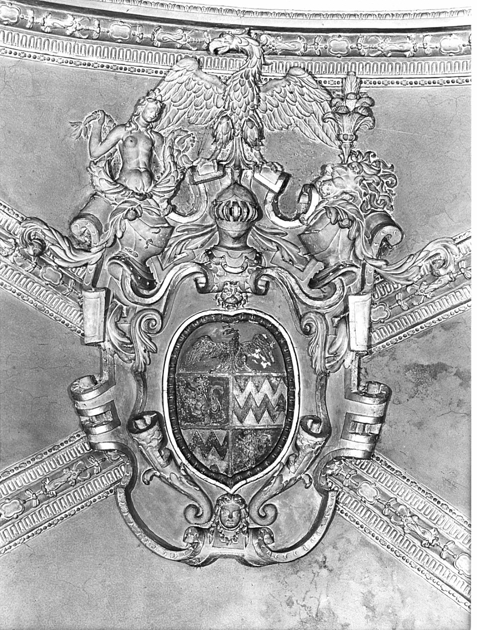 Una cornice in stucco a volute vegetali sporgenti circonda uno stemma