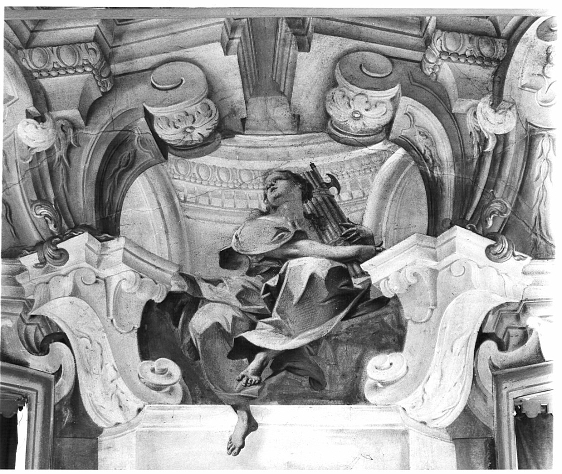 Virtù cardinali: Giustizia. Attributi: (Giustizia) fascio littorio. Architetture fantastiche