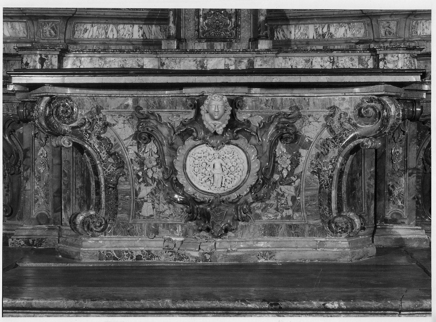Paliotto con al centro un rilievo in marmo bianco con la raffigurazione della Vergine tra angeli, entro motivi a fogliami, sormontati da una testina d'angelo applicata