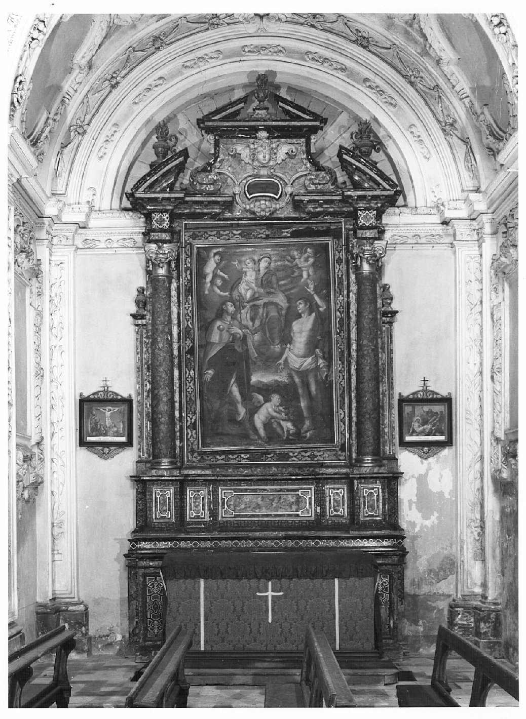 Altare in legno dipinto imitante il marmo. Si compone di una base con due pilastri decorati con finte tessere rosse e gialle a bordi dorati su fondo nero. Seguono un gradino con finti intarsi rosa e verdi su fondo verde e un'alta fascia con grandi tessere sagomate di colore rosa. Colonne verdi con basi e capitell ionici dorati. In alto il dossale è chiuso da un timpano spezzato ornato al centro da una testa di cherubino in marmo bianco e cimato da tre vasi. La mensa è formata da un tavolo di legno, il paliotto è in tessuto