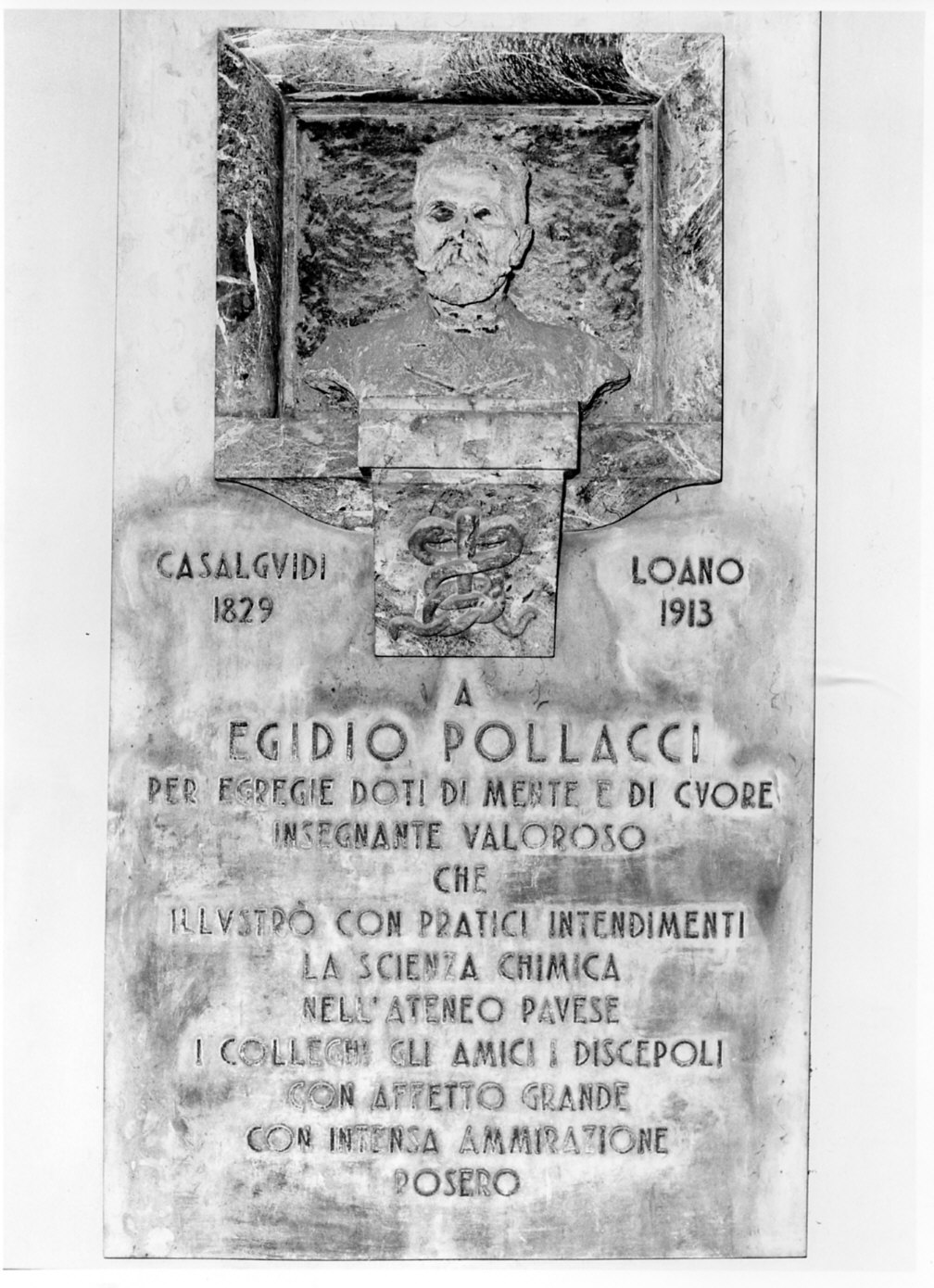 - ISCRIZIONI nella parte inferiore - CASALGVIDI 1829 - LOANO 1913/ A/ EGIDIO POLLACCI/ PER EGREGIE DOTI DI MENTE E DI CVORE/ INSEGNANTE VALOROSO CHE/ ILLVSTRO' CON PRATICI INTENDIMENTI/ LA SCIENZA CHIMICA/ NELL'ATENEO PAVESE/ I COLLEGHI GLI AMICI I DISCEPOLI/ CON AFFETTO GRANDE/ CON INTENSA AMMIRAZIONE/ POSERO - lettere capitali - a intaglio -