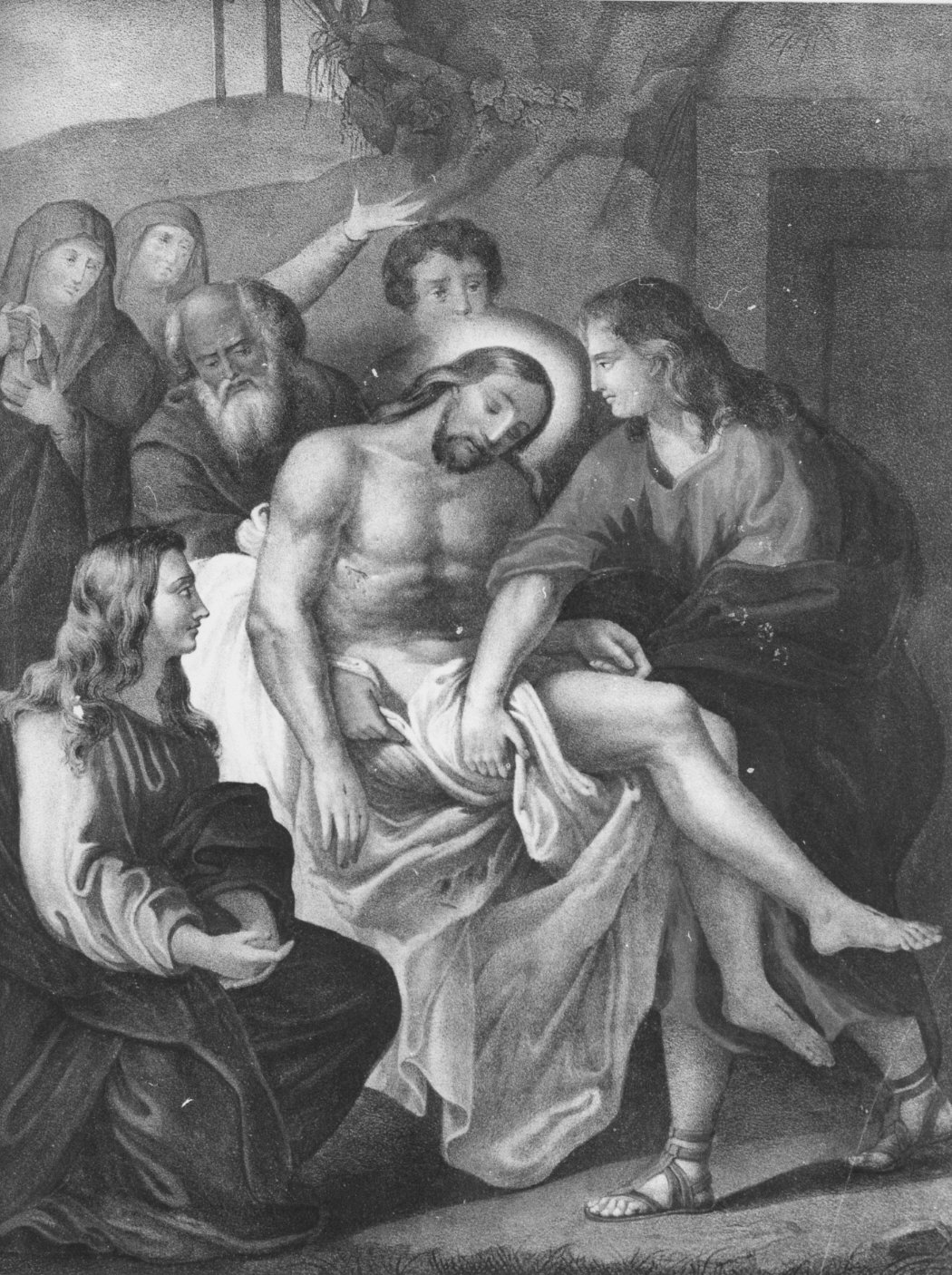 - NOTIZIE STORICO CRITICHE Nella cornice in alto al centro: Stazione XIV. In basso al centro: Gesù deposto nel sepolcro. A piè pagina versetti da: (a sin.): Vecchio Testamento, in basso a sinistra: Isaia cap. 53 v. 9; Ez. cap. 24 v. 45; Nuovo Tstamento in basso a destra Matt. cap. 27 v. 60. In basso al centro: Milano presso l'editore Antonio Vallardi, cont. S. Margherita III8. Prodotto industriale a grande diffusione in concomitanza dello sviluppo delle tecniche di stampa nei decenni a cavallo dell'Ottocento e Novecento. Si tratta di opere di gusto popolare e narrativo con affinità di composizione e caratteri tanto nel gusto sacro quanto in quello profano. E' la prima delle serie di 14 stazioni della Via Crucis. L'intera Via Crucis fu ritrovata nei depositi della chiesa di Santa Maria Maddalena, arrotolata e con inizi di muffe per l'umido, appena qualche anno fa. Fu in seguito ripulita e riattata all'uso con una nuova intelaiatura e cornice. Testimonianza orale dell'attuale parroco