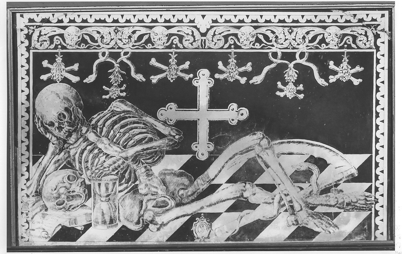 Paliotto con raffigurato un scheletro sdraiato su di un fianco e una croce trilobata al centro