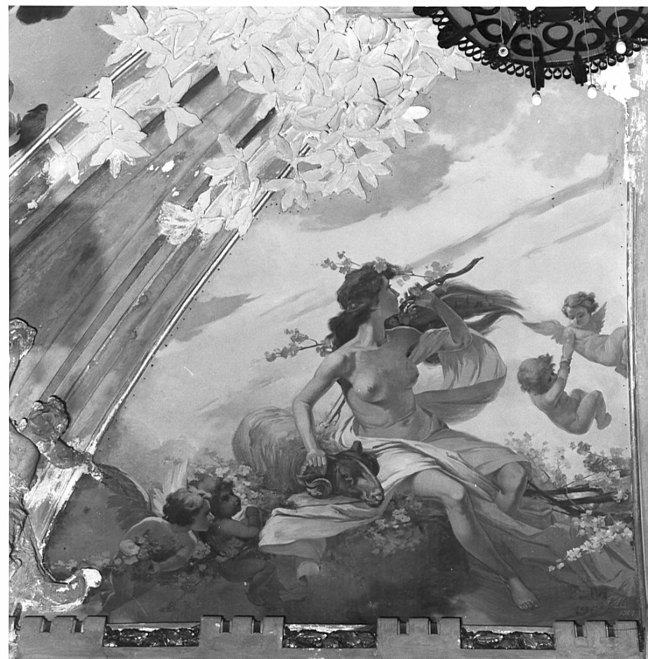La composizione, scandita in tre dipinti, presenta ninfee, amorini e fiori, raffiguranti la Primavera con i Segni dello Zodiaco: da sinistra Ariete, Toro e Gemelli