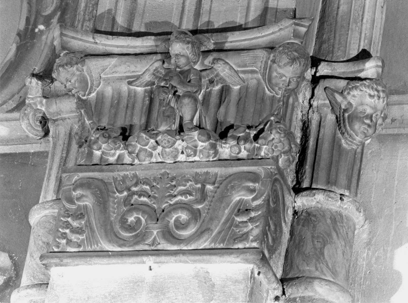 Procedendo da sinistra verso destra i capitelli monolitici presentano nel primo un tondo con foglia d'alloro e busto di guerriero tra angioletti nudi ad altorilievo con tamburo e liuto, nel secondo un angioletto centrale con flauto. Nell'atrio capitello, tondo con testa di guerriero e angei con cornamuse