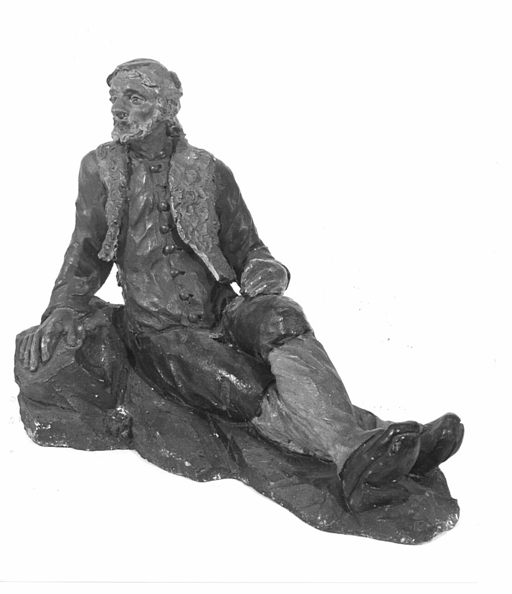 Figura di vecchio barbuto, adagiato su una base a forma di roccia; indossa un panciotto rossiccio abbottonato, giubotto senza maniche in pelle di capra, braghe scure, ghette gialle, zoccoli scuri. Appoggia la mano sinistra sul ginocchio, la destra sul masso. Retro grezzo