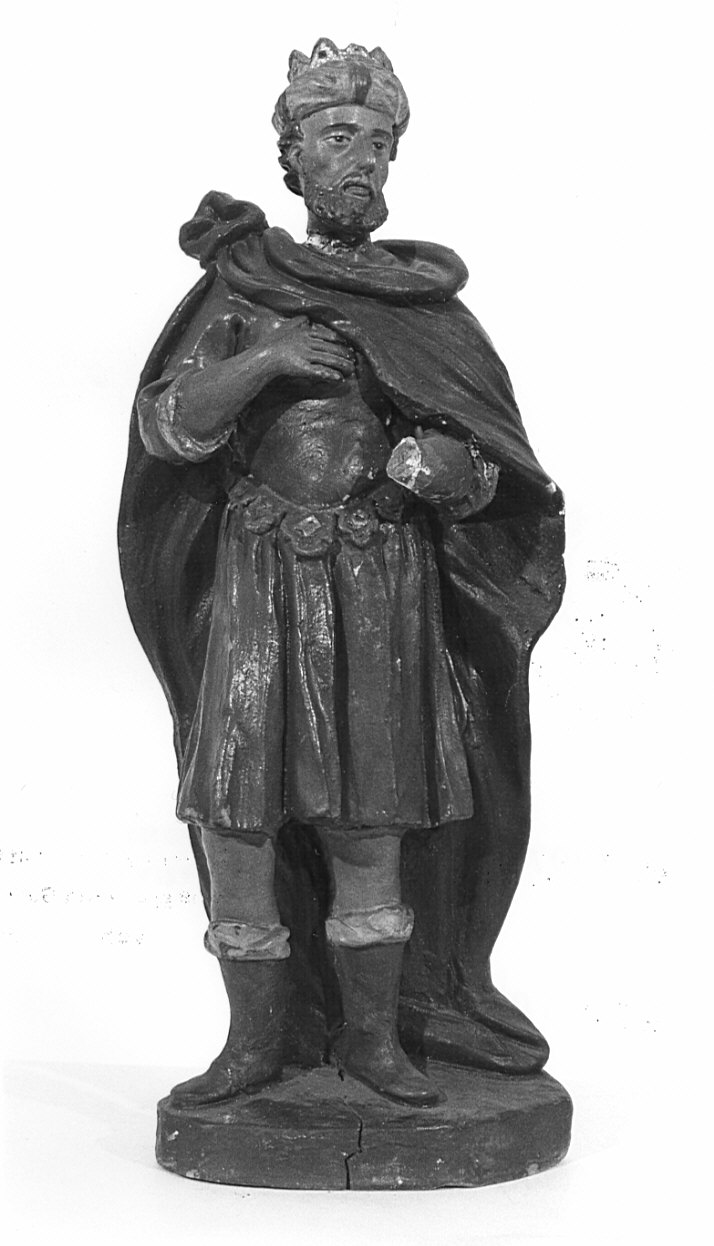 Re Mago di colorito scuro, con barba e baffi, corona dorata appoggiata su un turbante chiaro. Indossa corpetto rosso, sottana a pieghe marrone chiaro con cintura a grosse borchie, ampio mantello verde, calze gialle, calzari rossi bordati di bianco. Retro rifinito e dipinto, base circolare