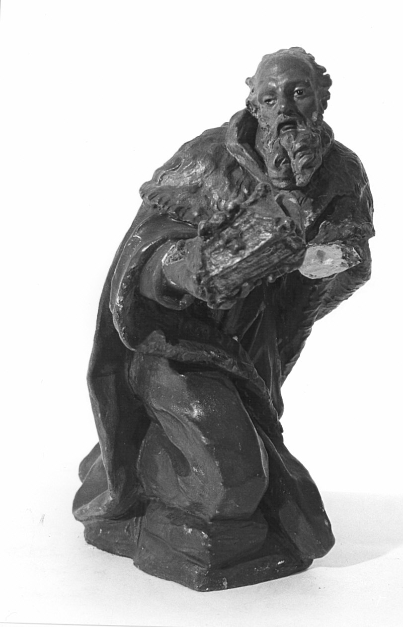 - NOTIZIE STORICO CRITICHE A questa statuetta va abbinata sicuramente quella del paggio che regge la corona ( scheda 0300070913-5). La statuetta, insieme ad altre quindici, fa parte di un unico presepe: il materiale usato, l'altezza e le proporzioni delle figure, i basamenti della stessa forma, la tipologia dei volti, il trattamento dei panneggi, la qualità del modellato fanno ritenere le statuette provevienti dalla stessa bottega di un abile plasticatore del sec. XVIII. Alcune disparità nella qualità delle figure si possono giustificare con la maggiore o minore importanza nella disposizione delle figure all'interno del presepe, mentre altre, soprattutto nelle parti più esposte a rotture, con le mani, possono essere attribuite a vecchi restauri. La totale mancanza di dati documentari non consente di risalire alla committenza nè alla regione di provenienza; i caratteri stilistici fanno propendere per una manifattura lombarda, anche se presepi in terracotta policroma non sembrano molto diffusi in Lombardia nel sec. XVIII, mentre sono più comuni in area emiliana