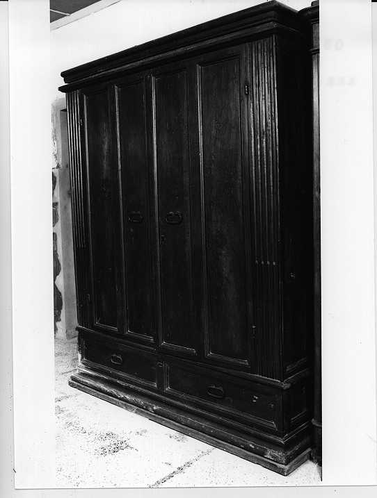 Armadio a due ante e ciascuna presenta due lunghe formelle lavorate con la pialla e riquadrate da semplici modanature. Due lesene scanalate sono poste all'estremità e sorreggono il coperchio dal profilo modanato e aggettante. Nella parte inferiore vi sono due cassetti e un alto piede sagomato a gola e a becco d'oca. Le quattro maniglie sono in tondino di ferro sagomato a fagiolo