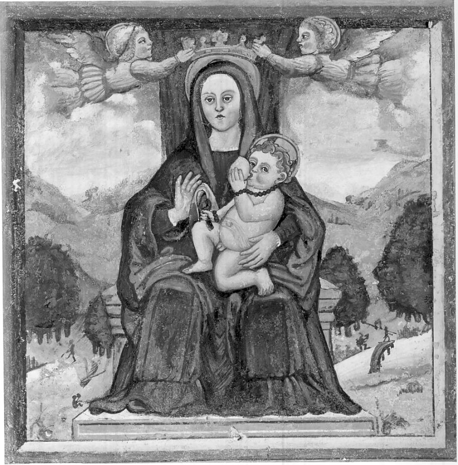 Soggetti sacri: la Madonna è seduta ed allatta Gesù nudo ma con i polsi e il collo ornati di corallo; il trono ha un alto dossale di stoffa sulla quale in alto risalta la corona trattenuta da de angeli; un paesaggio agreste con colline fa da sfondo