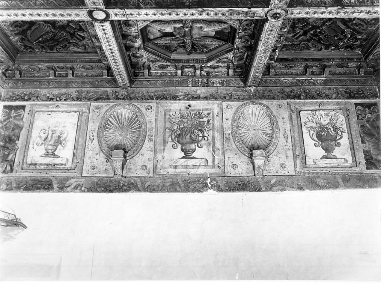 Tra due fasce con intreccio vegetale si svolge il fregio. Per ogni parete tre riquadri ornati con vasi di fiori (dipinti nel tardo settecento) si alternano con due tazze in stucco con mensole. Negli spigoli paraste angolari decorate con panoplie dipinte