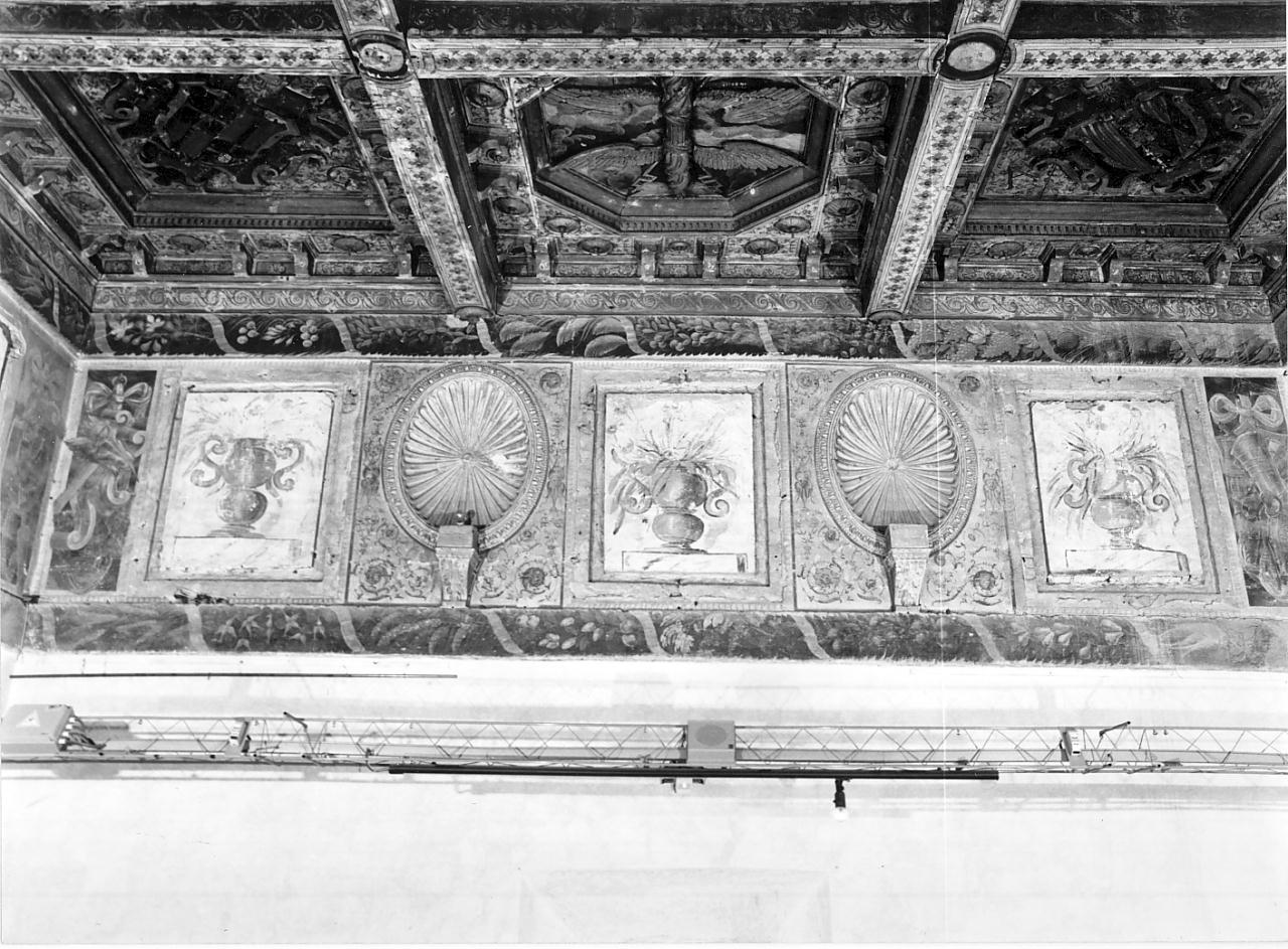 - NOTIZIE STORICO CRITICHE I vasi dei riquadri, cui forse in origine erano appesi quadri, appaiono tardi: probabilmente della fine del XVIII secolo. Le mensole sono prive dei busti che originariamente dovevano essere esposti. Il motivo delle panoplie dipinte nelle paraste ricorre anche nella sala degli Specchi del palazzo del Giardino