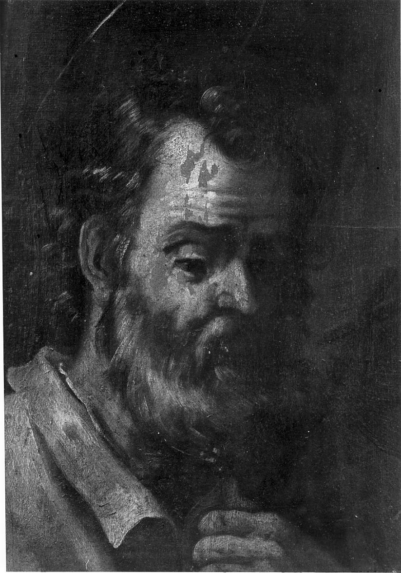 Personaggi: San Filippo. Attributi: (Santo) mezzo busto; rivolto erso a destra; con capelli e barba scuri; gli occhi rivolti verso il basso in atteggiamento meditativo; mano sinistra sul petto; impugna la croce