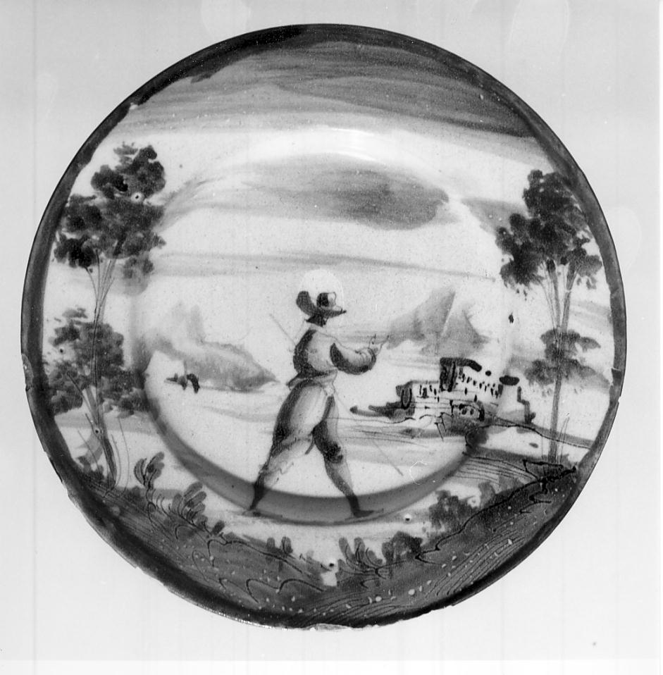 - NOTIZIE STORICO CRITICHE Per le caratteristiche tonalità del blu e per le connotazioni del paesaggio l'esemplare rimanda alla manifattura savonese del secolo XVIII, confermata peraltro dalla svvelta figurina maschile camminante verso destra derivata dalla maniera del Callot. Per quanto riguarda invece la marca, i segni dipinti a rovescio non permettono l'identificazione della fabbrica, che potrebbe essere quella dei Conrado di Albisola o dei Grosso o dei Chiodo di Savona spesso riproducenti figurine di uomo e donna accostati, mentre nell'esemplare in questione la coppia è sdoppiata e l'immagine campeggia isolata nel paesaggio