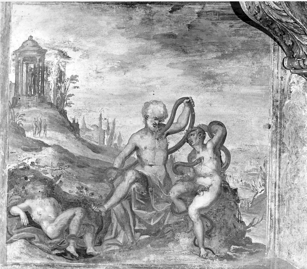 Il riquadro è dipinto con l'episodio dei serpenti, inviati da Nettuno che assalgono e uccidono Laocoonte e i suoi figli. Varie scalfitture nella parte inferiore e abrasioni in alto a sinistra, accanto al tempietto circolare