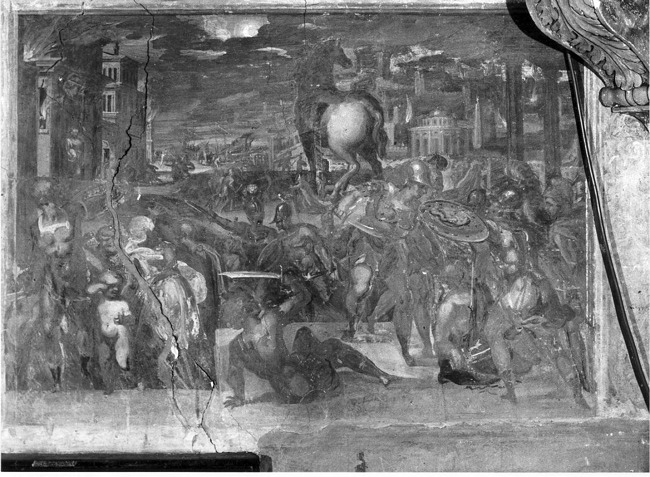 nel riquadro viene illustrato il momento in cui, usciti nottetempo a cavallo, i Greci sorprendono i troiani appiccano fuoco alla città e fanno strage dei suoi abitanti. Lunghe crepe a sinistra e scalfitture nella parte inferiore hanno causato la caduta di piccole porzioni di colore
