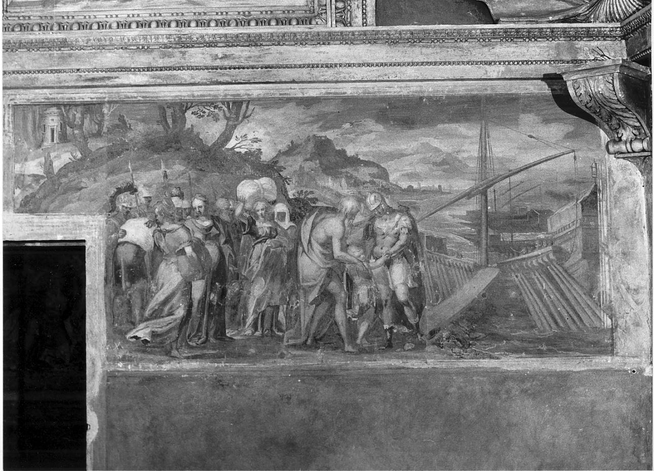 Enea, Anchise e Julo, con i Troiani superstiti, dopo aver costruito una flotta si imbarcano presso Antandro, sotto i monti dell'Ida. Nel suo quarto inferi ore l'affresco mostra una fascia segnata da urti e graffi