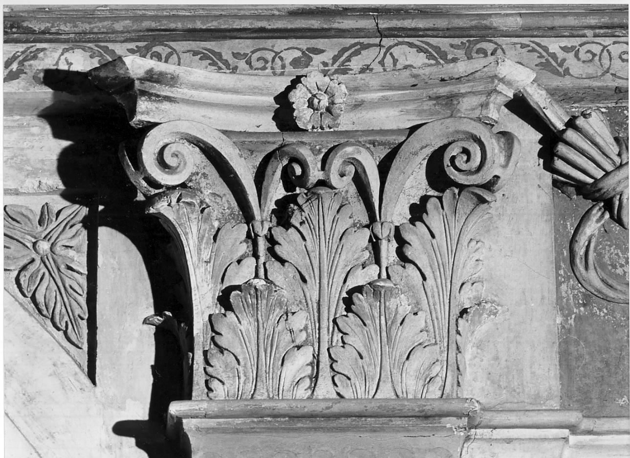 Le lesene sono dipinte e fingono una superficie modulata da scanalature inferiormente rudentate; sopra il collarino è modellato un capitello corinzio dalle slanciate foglie di acanto e dai cauli ben rilevati