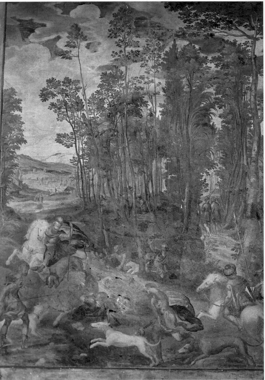 Nonostante sia comunemente ritenuto una indefinita scena di caccia, l'episodio pare illustrare l'uccisione del cinghiale Calidonio a opera di Meleagro, che lo trafigge con un'asta nella schiena dopo che Atalanta (la figura femminile, armata, nel vicino boschetto) l'aveva leggermente ferito, come racconta Ovidio (Metamorfosi, VIII, IX-X). Diffuse efflorescenze e sudiciume velano la parte inferiore