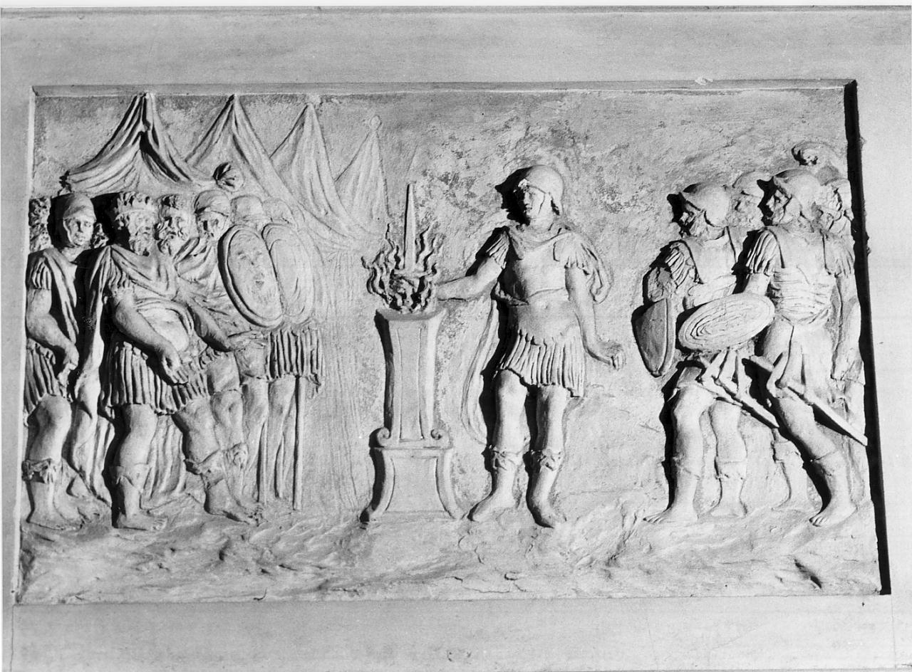 Nel riquadro a stucco, a bassorilievo, è raffigurato il celebre episodio di Muzio G. Cordo, detto in seguito Scevola, che si brucia la destra per aver fallito il tentativo di uccidere Porsenna nel suo accampamento