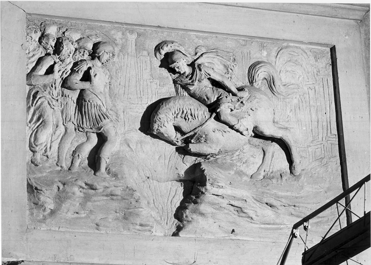 Nel bassorilievo è raffigurato il giovane patrizio romano Curzio Marco che, armato di tutto punto e in sella al suo cavallo, si getta nella grande voragine apertasi nel Foro di Roma. Il riquadro è integro, se si eccettua la mancanza della zampa anteriore del cavallo