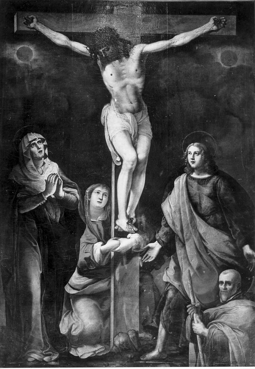 - NOTIZIE STORICO CRITICHE Il quadro, come ha rilevato il dottor Berzaghi che ha notato la firma, è attribuibile a Iacopo Borbone, pittore nativo di Novellara, attivo tra la fine del XVI e gli inizi del XVII secolo; il suo più antico lavoro è datato infatti 1611 e si trova nella chiesa di San Cassio a Narni. L'artista operò anche a Mantova nel chostro dei Minori Osservanti, dipingendo scene della vita di San Francesco. Di quest'opera però oggi non esiste alcuna traccia. Il dipinto della Crocifissione, in cui sono evidenti i riferimenti alla pittura emiliana del secolo XVII, nel 1820 era posto nella Cappella del Crocifisso ed era così descitto: "Vedesi l'immagine del Crocifisso dipinta su tela, avente ai piedi le Marie piangenti e San Giovanni Evangelista ed altra immagine che communemente credesi il ritratto del pittore steso". Nella visita pastorale del 1835 si dice che il dipinto è "sopra la porta maggiore"