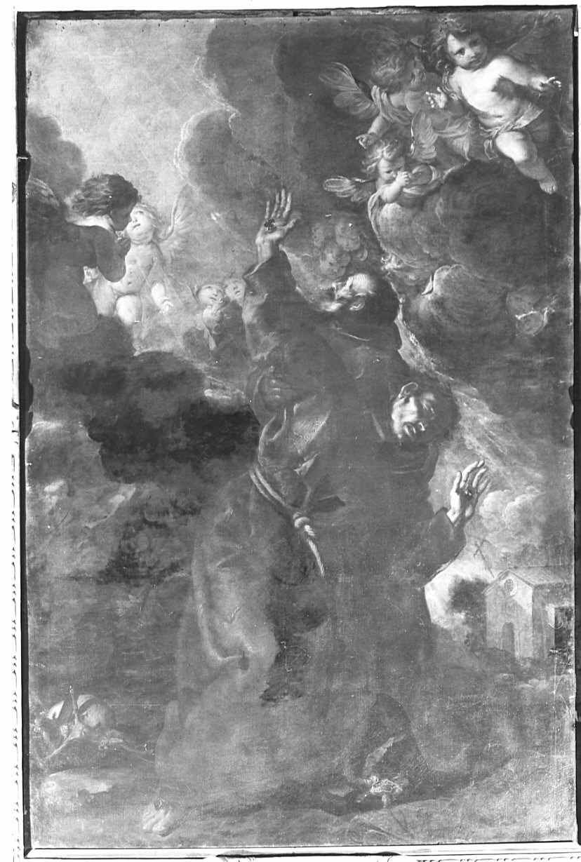 Personaggi: San Francesco d'Assisi. Architetture: chiesa di Verna. Figure maschili: confratello del santo. Fenomeni metereologici: nuvole. Figure: angeli; cherubini