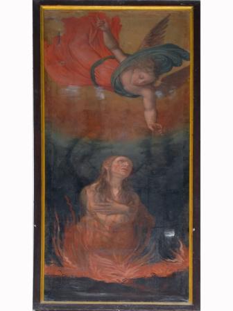 In basso è una donna nuda, con lunghi capelli biondi, emergente a mezza figura dalle fiamme che salgono dal suolo; in alto è un angelo volante, con veste rossa e manto blu, che tende la mano sinistra verso la donna, mentre con la destra fa cenno verso l'alto. Fondo azzurro, trascolorante in giallo verso l'alto. Tela entro cornice a listello nera