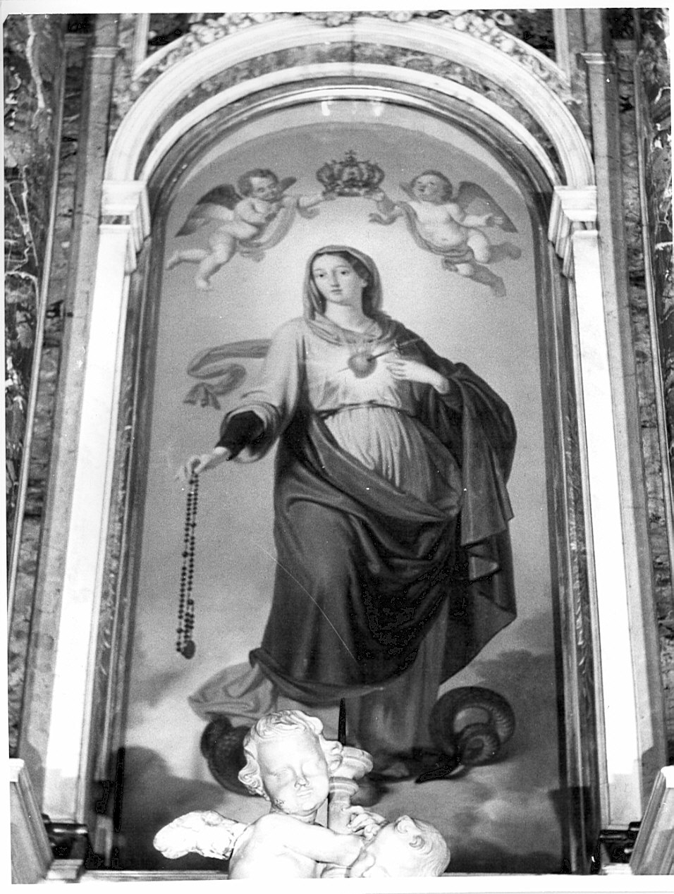Personaggi: Madonna. Oggetti: Rosario; corona. Animali: serpente. Figure: angioletti