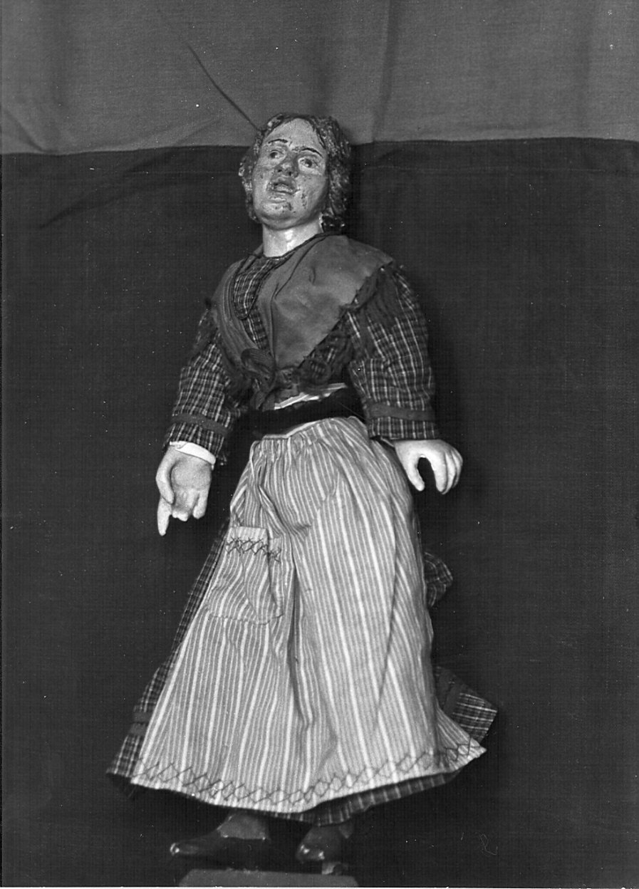 Donna in età matura, eretta, con bocca spalancata e braccia allargate. Indossa camicia rossa a quadrettoni, scialle blu, grembiule azzurro a righe bianche, scarpe nere. Testa, mani e piedi in legno dipinto