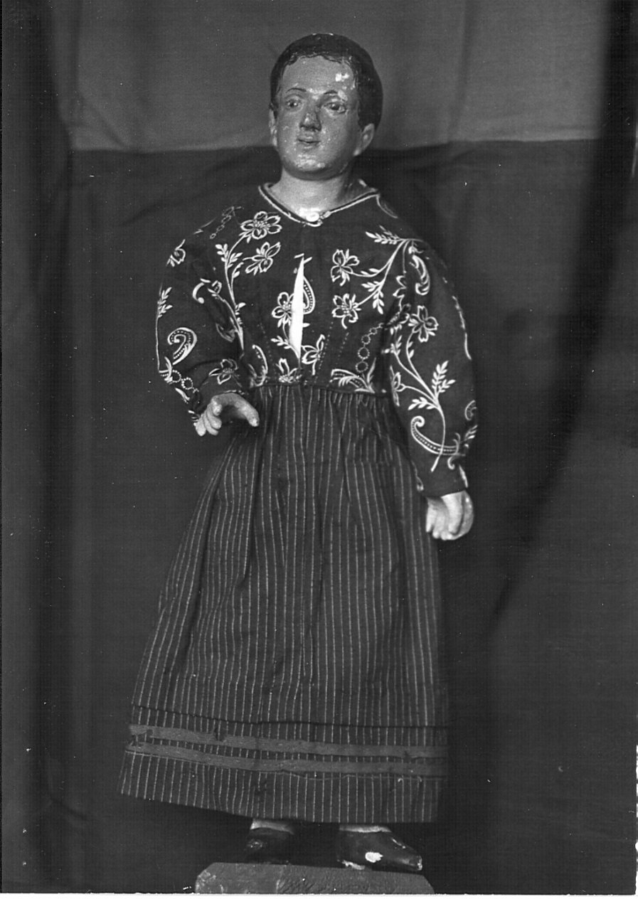Donna giovane, eretta, con mano destra tesa in avanti. Indossa camicia blu a fiori bianchi e gonna blu a righine verticali bianche con bordature cucite rosse. Testa, mani e piedi in legno dipinto