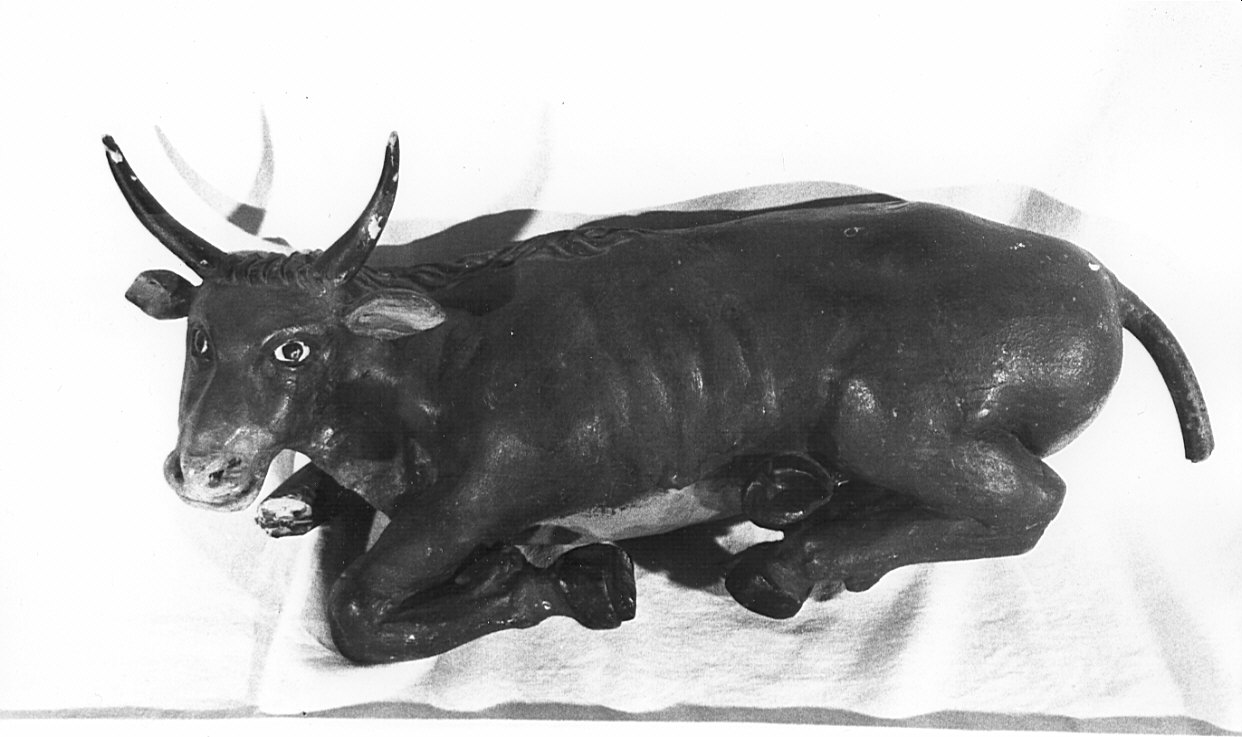 Bue accasciato, volto a sinistra, con muso girato in avanti. Legno dipinto di bruno, con zone bianche sul muso e sul ventre