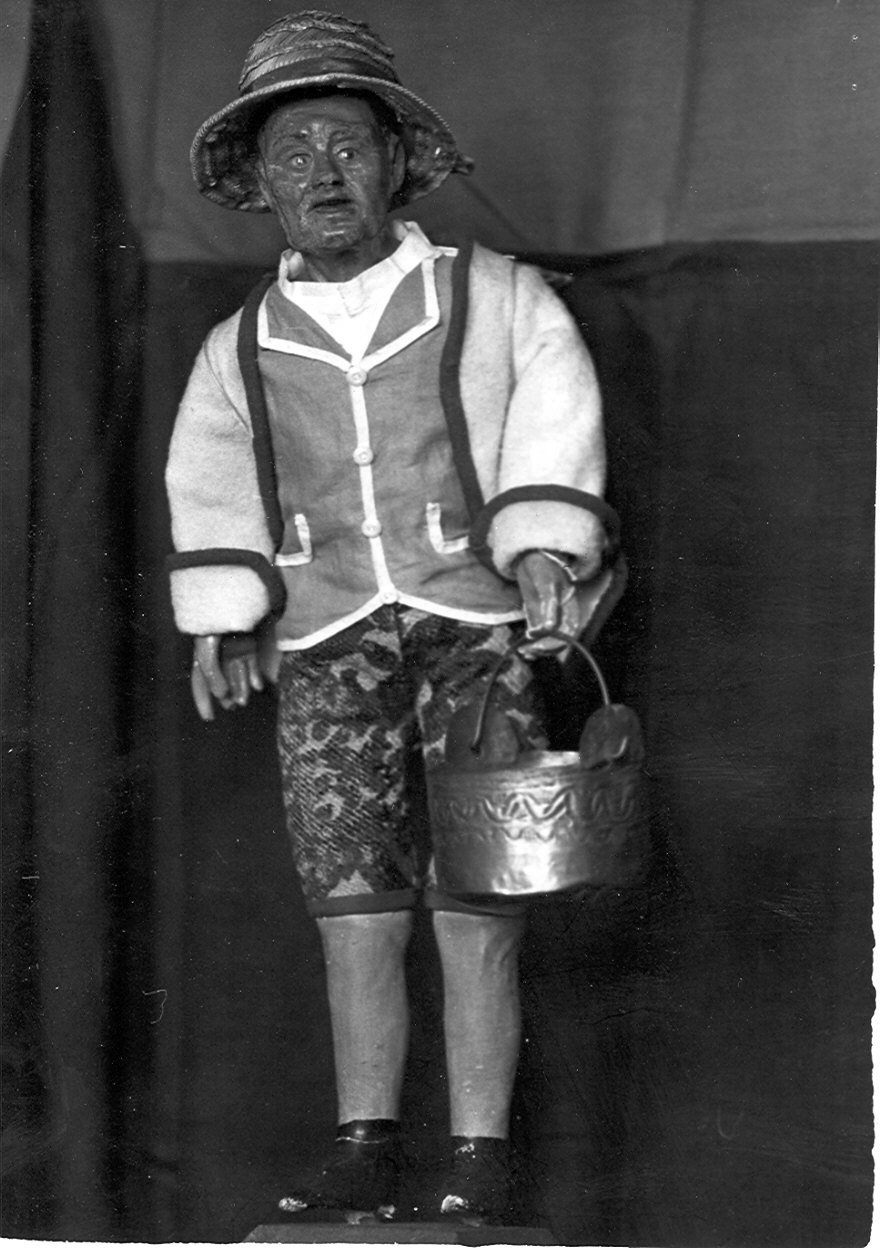 Uomo maturo, di colorito molto scuro, eretto in atto di portare un paiolo di rame nella mano sinistra. Indossa camicia bianca, panciotto azzurro con bordi bianchi, giacca di lana bianca con bordi rossi, calzoni in seta damascata rossa e nera, calze bianche, scarpe nere. Ha in testa un cappello di paglia. Testa, mani, piedi in legno dipinto