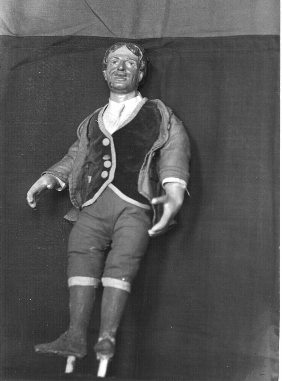 Uomo maturo, sbarbato, eretto, con braccia leggermente aperte in segno di adorazione. Gambe notevolmente storte. Indossa camicia bianca, panciotto bruno con bordi avorio, giacca oliva e rosa, calzoni rossi, calze brune. Testa, mani, piedi in legno dipinto