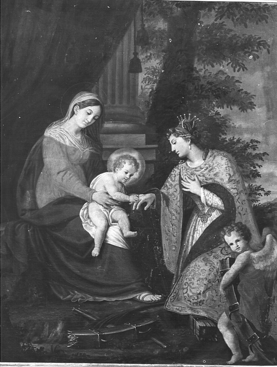 Personaggi: Madonna; Gesù Bambino; Santa Caterina d'Alessandria. Figure: angioletto. Elementi architettonici: colonna. Oggetti: frammento di ruota