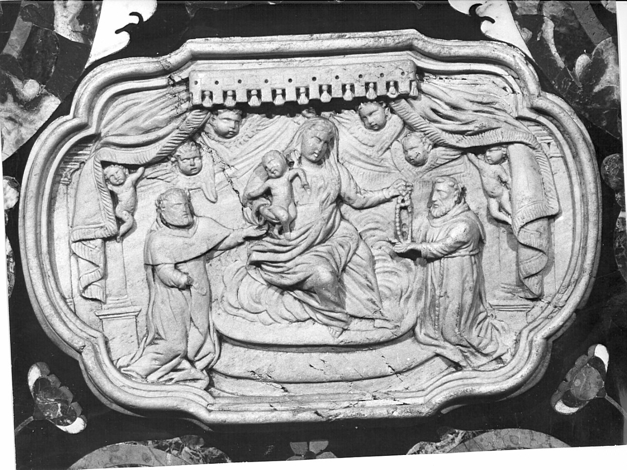 Il bassorilievo in marmo bianco, di formato sagomato, raffigura la Madonna del Rosario fra San Domenico e Santa Caterina