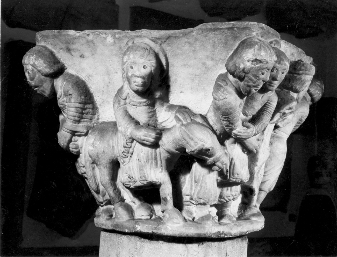 - NOTIZIE STORICO CRITICHE Il Venturi (1904, p. 204) ritiene che il capitello, del XII secolo, ricordi le sculture dei precursori emiliani dell'Antelami. Il Porter (1917, p. 34) lo data al 1135, ravvisandovi influssi di Wiligelmo e di Niccolò, dello Scultore della Porta dei Principi e di quello di San Celso di Milano. Lo studioso afferma che alcune figure, quali l'Angelo, sono simili a quelle poste su di un capitello del Museo Civico di Modena. Il Toesca (1927, p. 789) lo assegna alla II metà del XII secolo. Secondo il De Francovich (1940, pp. 248- 251) il capitello annovera numerose affinità con la scultura lombarda della prima metà del XII, per le teste grandi e volumetriche dallo sguardo fisso e severo, dovuto agli occhi impiombati, per i capelli striati ed aderenti al capo, per le pieghe avvolgenti e circolari delle maniche e per le mani enormi. Certi manierismi del panneggio possono rammentare le figure di Niccolò. Lo studioso conclude l'analisi affremando che alcune caratteristiche risultano affini a quelle dei rilievi della Porta dei Principi a Modena. I bordi serpeggianti delle pieghe dei manti dell'Angelo, di San Giuseppe e della Vergine risultano provenire dall'area Aragonese. Lo Zastrow (1978, p. 56) dopo aver considerato le alte doti qualitative del Maestro per la ricerca veristica e per la plastica realizzazione dei corpi, ritiene che appartenga al tardo XII secolo. Suppone inoltre che il capitello sia perfettamente inserito nella cultura Comasca. Bibliografia: G. De Francovich, Wiligelmo da Modena e gli inizi della scultura romanica in Francia e in Spagna, in "Rivista del reale Istituto d'rcheologia e Storia dell'Arte", 1940, VII, pp. 248- 251; O. Zastrow, Scultura carolingia e romanica nel Comasco: Inventario territoriale, Como 1978 (vedi rist. 1979 (1 rist. Como: Società Storica Comasca e 1981)