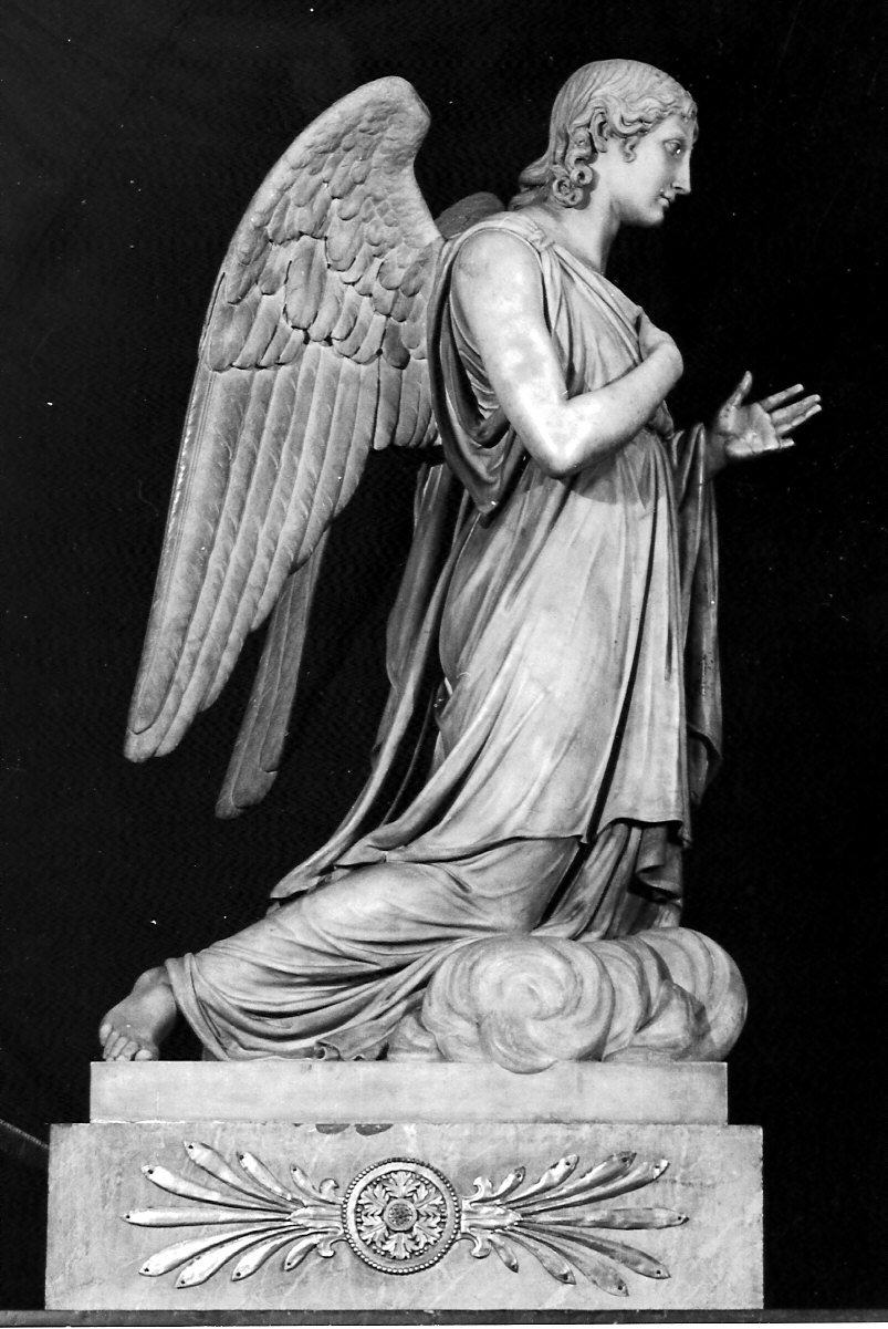 sopra una base quadrangolare recante sulla fronte una decorazione vegetale con rosetta e palmette è posta la statua di angelo inginocchiata sopra una nuvola, con veste a maniche corte, volto giovanile, capelli ondulati alle spalle, con la mano destra al petto e la sinistra alzata. Grandi ali piumate