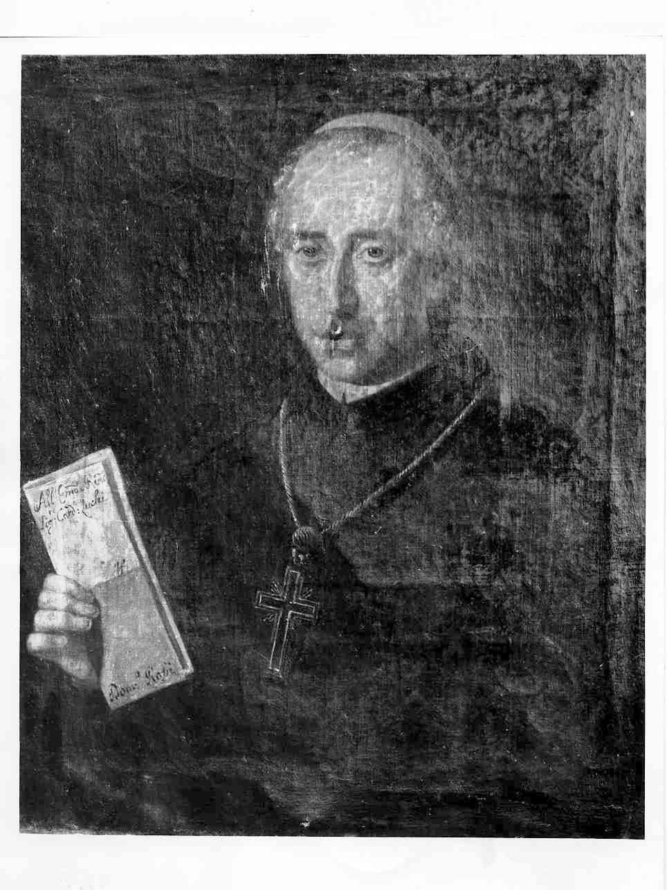 Personaggi: il prelato è raffigurato sullo sfondo nerissimo; regge con la destra la lettera sula quale si legge agevolmente l'indirizzo
